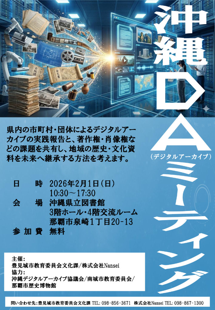 この度、豊見城市教育委員会の主催により、地域の歴史・文化資料を未来へ継承するためのフォーラム「沖縄DA(デジタルアーカイブ)ミーティング」を開催する運びとなりました。